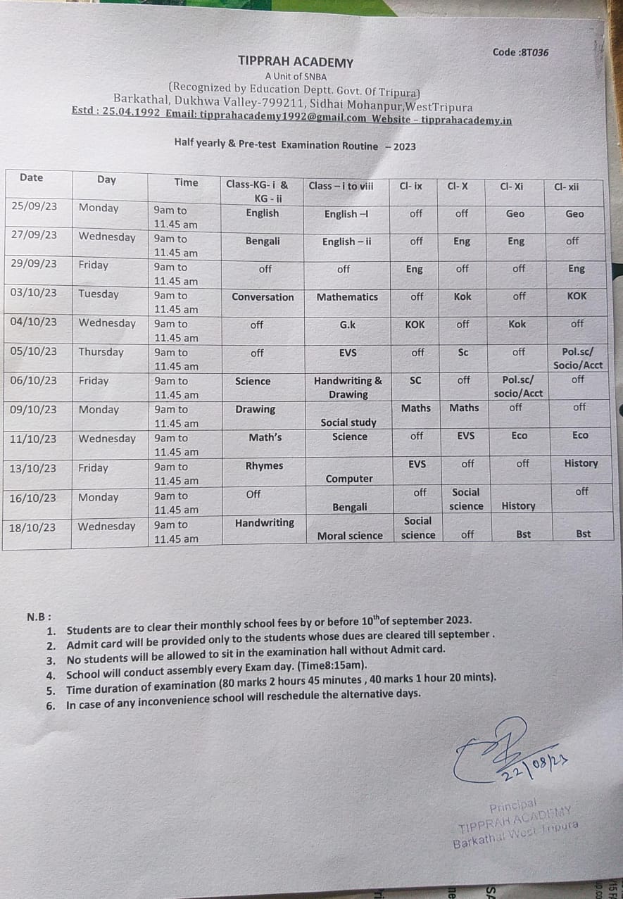 TIPPRAH ACADEMY H.S(+2) SCHOOL was established in 1992 and it is managed by the Pvt. Unaided( Unit of SNBA). It is located in Rural area. It is located in HEZAMARA block of WEST TRIPURA district . The school consists of Grades from KG-i to xii. The school is Co-educational and it have an attached pre-primary section. The school is Not Applicable in nature and is not using school building as a shift-school. English is the medium of instructions in this school. This school is approachable by all weather road. In this school academic session starts in April. The school has own Private building. It has got 18 classrooms for instructional purposes. All the classrooms are in good condition. It has 4 other rooms for non-teaching activities. The school has a separate room for Principal and vice-principal. The school has Boundary Wall .The school has have electric connection. The source of Drinking Water in the school is Tap Water and it is functional. The school has 10 boys.